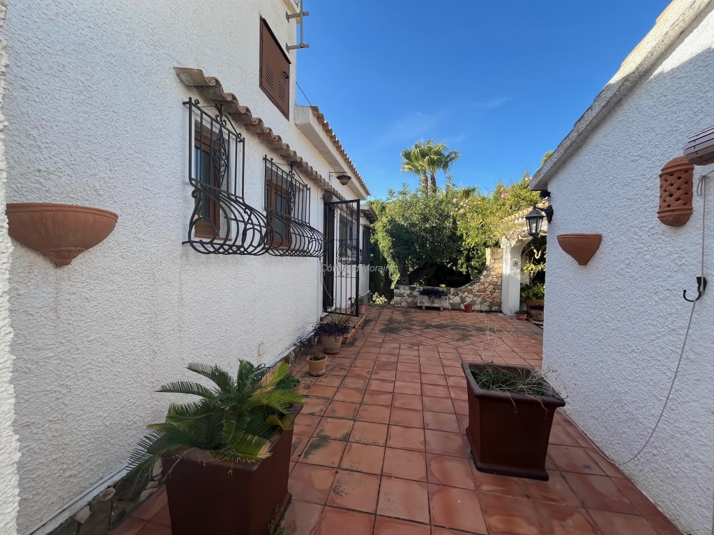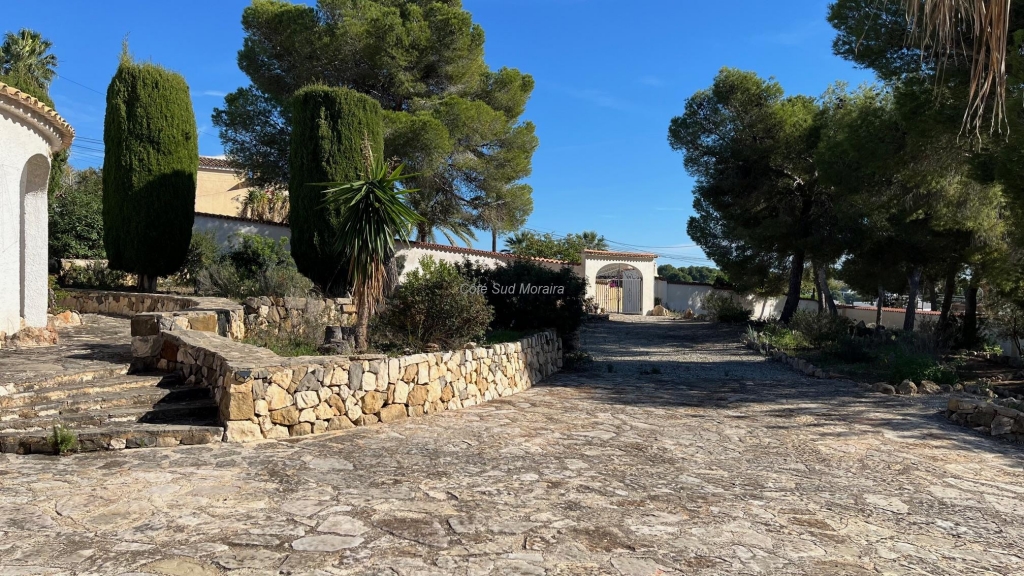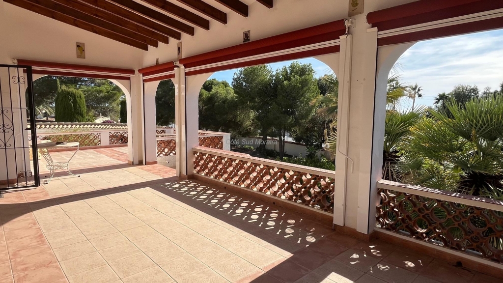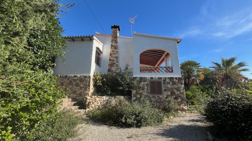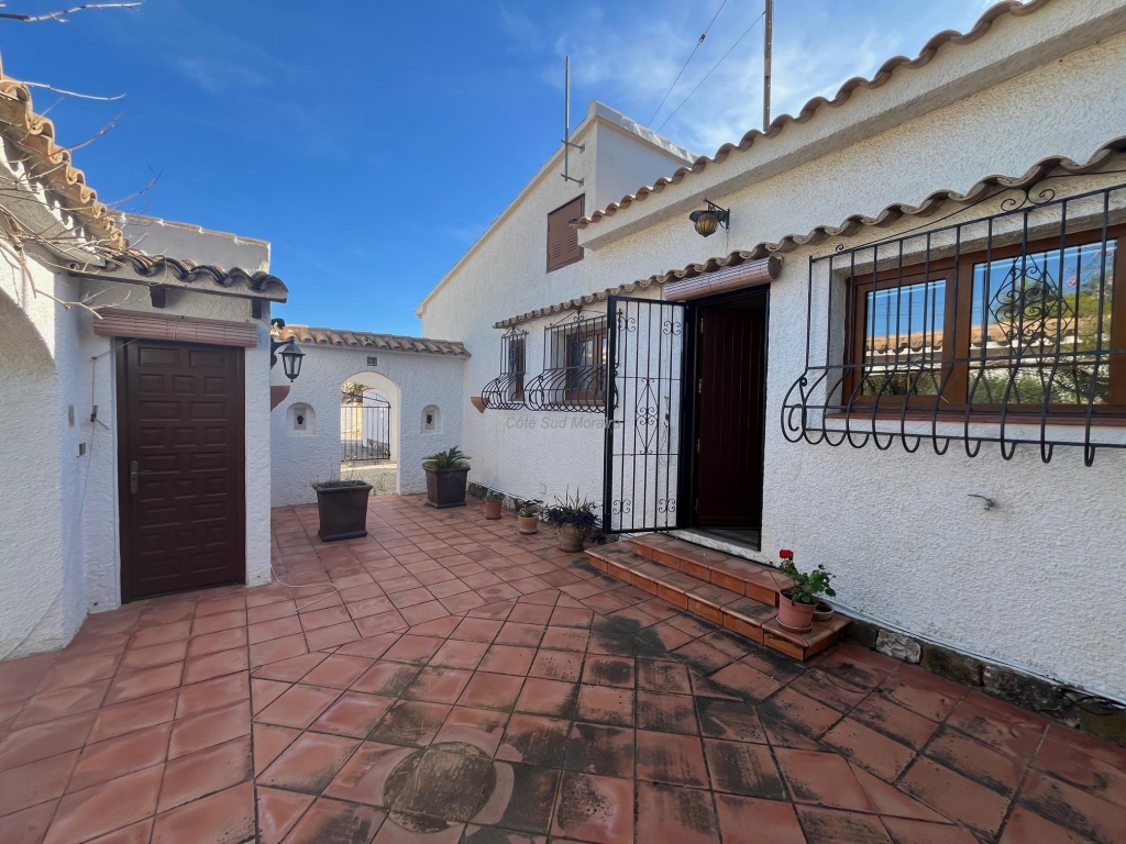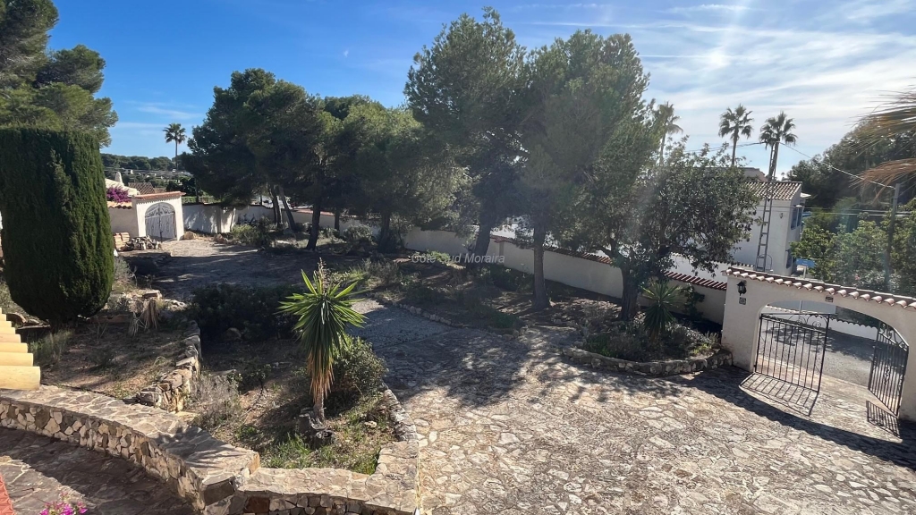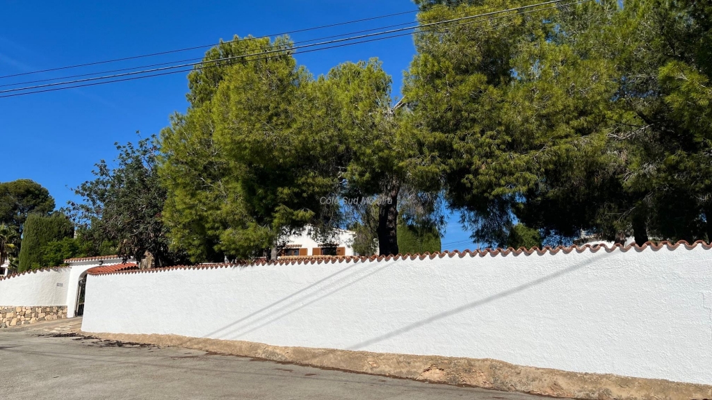 Spacious Spanish-style villa with great potential for modernization. Access from two streets to this large 1,788 m² plot with a traditional villa built in the early 1970s. The house faces south and is surrounded by beautiful gardens with several fruit trees, pine trees, and olive trees. Seating areas at the front and rear of the villa. A few steps lead to the spacious, typically Spanish covered terrace with access to the good-sized living room with a central wood-burning stove. Separate dining room with exposed beams. A large, recently modernized separate kitchen, two good-sized double bedrooms and one single bedroom, two renovated bathrooms. An underground garage and a huge workshop. A separate laundry room and a pantry that could be converted into a guest room. Plenty of space to extend the villa and build a swimming pool. Electric radiators and double-glazed windows. Close to Baladrar beach. A unique opportunity to purchase a large plot of land close to the beach.