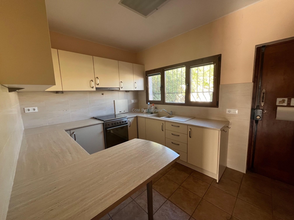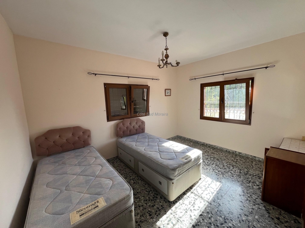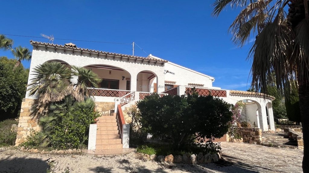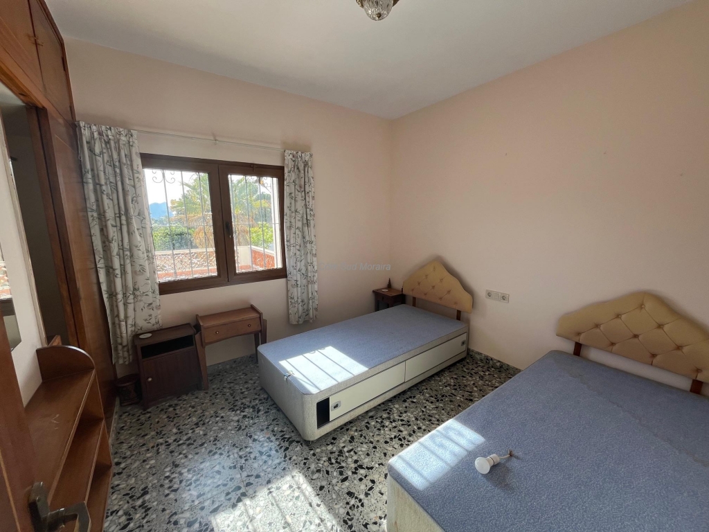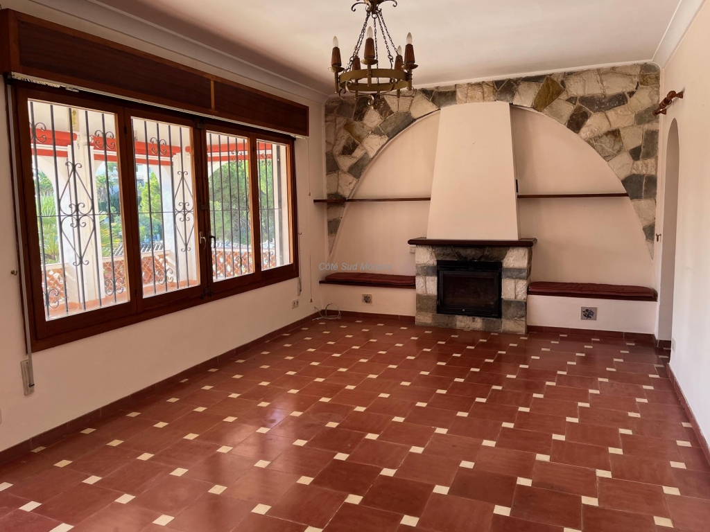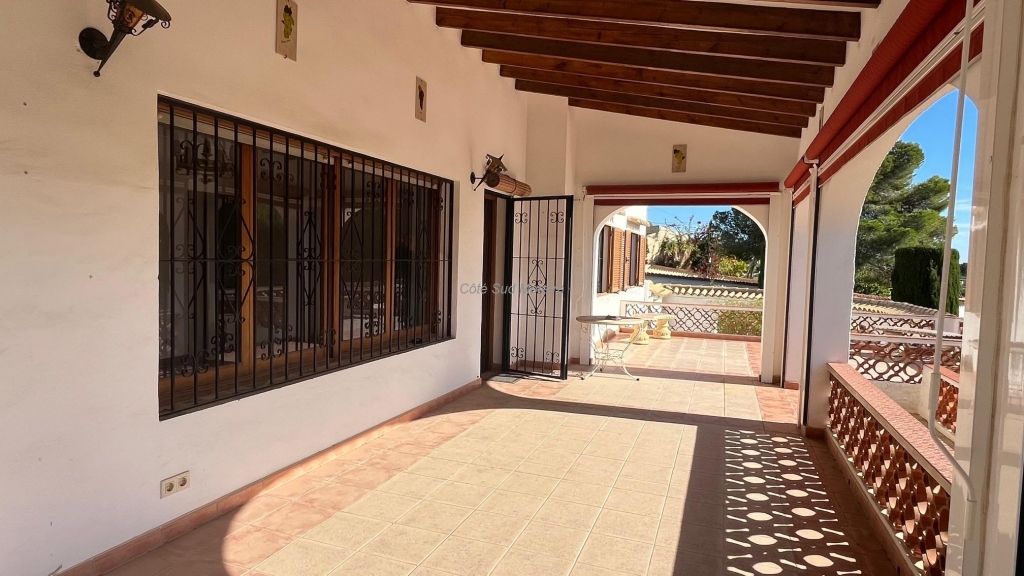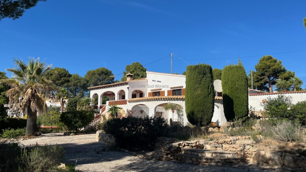 Spacious Spanish-style villa with great potential for modernization. Access from two streets to this large 1,788 m² plot with a traditional villa built in the early 1970s. The house faces south and is surrounded by beautiful gardens with several fruit trees, pine trees, and olive trees. Seating areas at the front and rear of the villa. A few steps lead to the spacious, typically Spanish covered terrace with access to the good-sized living room with a central wood-burning stove. Separate dining room with exposed beams. A large, recently modernized separate kitchen, two good-sized double bedrooms and one single bedroom, two renovated bathrooms. An underground garage and a huge workshop. A separate laundry room and a pantry that could be converted into a guest room. Plenty of space to extend the villa and build a swimming pool. Electric radiators and double-glazed windows. Close to Baladrar beach. A unique opportunity to purchase a large plot of land close to the beach.