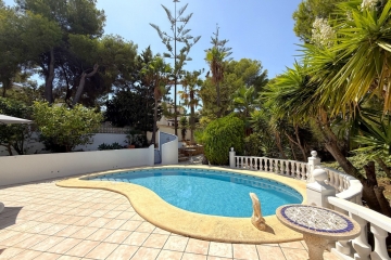 This beautifully maintained three bedroom, two bathroom villa is just a short stroll from Moraira’s centre and offers the perfect balance of modern comfort and Mediterranean charm. A private driveway leads to ample parking, two garages and a large workshop. Steps rise to a distinctive terraced courtyard, creating a welcoming entrance. Inside, the open-plan kitchen is fully equipped with generous workspace, pantry, and laundry area, flowing into a bright dining space. Patio doors open onto a covered terrace overlooking the kidney-shaped 8 x 4 pool, sunny terraces, and mature gardens.The spacious lounge features a central log burner and direct access to a terrace with lovely views. The master suite includes a walk-in wardrobe and en-suite bathroom, while two further large bedrooms share a stylish family bathroom, one with its own terrace access. Additional highlights include gas central heating, hot/cold air conditioning, double glazing with mosquito nets, external shower, solar heating for the pool and cover, LED garden lighting, optional pool safety fence, and a 42 m² roof terrace with panoramic views. Main furniture is included, this villa truly has it all.