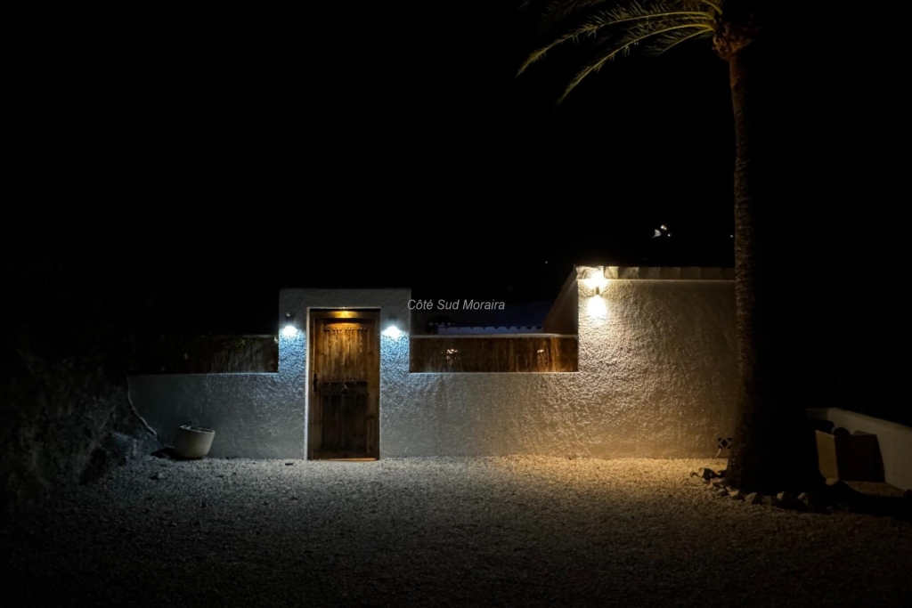We present this beautiful Mediterranean single-story villa on a flat plot in the quiet and green area of Benimeit in Moraira. Ideal for people looking for an easy-to-maintain home with peace, space, and comfort. The property is located on a spacious and flat plot of 849 m2 on a quiet road with only local traffic, less than an 8-minute drive from Moraira center and the beach. Upon entering the fenced plot, there is ample space to park several cars on site. What immediately stands out are the beautiful mature palm trees that accentuate the Mediterranean atmosphere of the property.