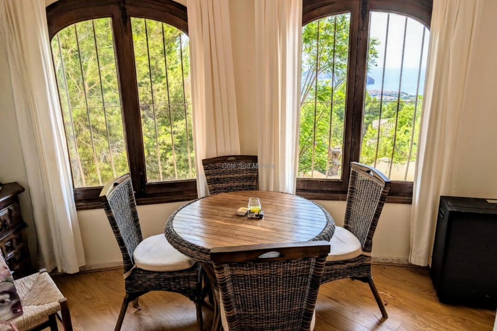 This villa is located in the quiet residential area of Benimeit in Moraira. The property is distributed over two floors with an internal staircase and situated on a large inclining plot. There is parking for two cars outside the vehicle gate and parking for several cars/vehicles inside the villa. From the parking area there is a path and then six steps up the balcony where the front door is located. You enter into the villa into a small hallway which includes the guest toilet, from here you enter into a very large living dining area with feature fireplace, beamed ceiling and many traditional features. To the right through an archway is the kitchen which includes blue and white cupboards and Blue Pearl granite worktops. Appliances include oven, gas hob, extractor, dishwasher and fridge/freezer. Further down the hallway is the back door to the open terraces and the barbecue area, and then you enter the master bedroom, a large room with built-in wardrobes and an archway leading to the spacious en-suite bathroom which has two vanity basins, bath and shower. Through double doors in the living room you enter the semi-circular terrace with glass curtains and wonderful sea and countryside views, a wonderful place to dine or relax. Off to the left of the living room is an office area in the landing at the top of the staircase, at the bottom of the staircase is a lockable door, handy if you wish to separate the two living areas. The ground floor also has a very large living/dining area with an open plan kitchen area, the same design as the kitchen upstairs and including the same appliances. Off the living room there are two large bedrooms with en-suite bathrooms, another double bedroom and a house shower room. One of the bedrooms has access to the house parking area and another has access to an under-build storage area. From the living room there is a door out to the open terrace where you will find a utility room and the staircase down to the pool. The pool terrace has plenty of space for sunbeds and includes a 11 x 3m pool, there us a large lower garden beeath the pool area which has been left natural.