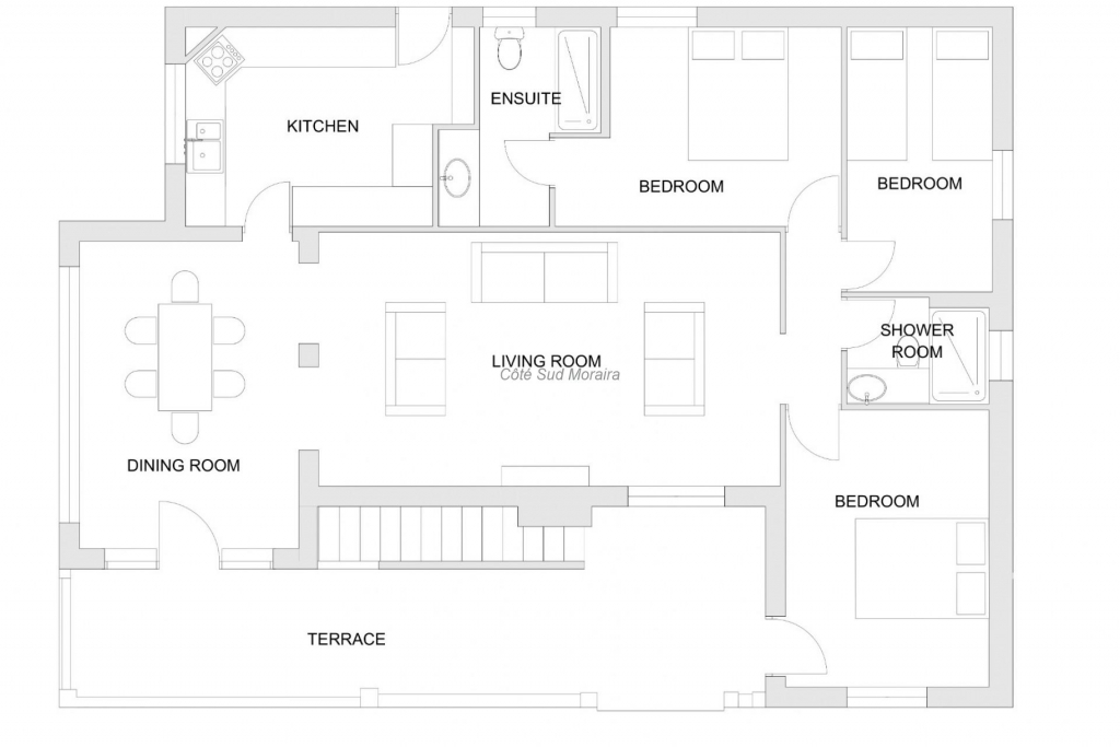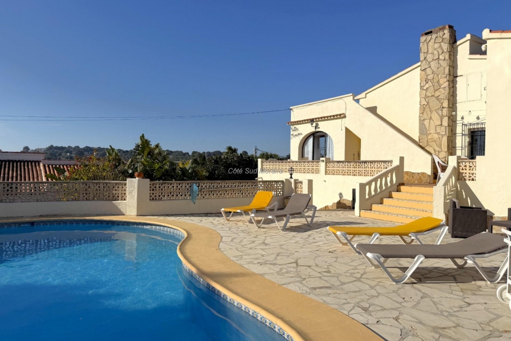 Located in a quiet residential area within easy walking distance of Moraira, this well-maintained villa offers generous accommodation, excellent outdoor space, and great accessibility. Set on a completely flat plot, the property provides easy access and excellent usability, making it ideal for families, retirees, or as a holiday retreat. A gated entrance opens onto a private driveway with ample parking for several vehicles. On this level, there is also a substantial under build currently used for storage, offering excellent potential to be converted into a garage or additional accommodation if desired. A few steps lead up to an inviting terrace overlooking the 9 x 5 kidney shaped pool, surrounded by multiple terraced seating areas—perfect for relaxing, sunbathing, or entertaining guests. The villa is set on a flat plot and enjoys a lovely Mediterranean garden featuring lemon, lime, orange, and nispero trees, adding both charm and practicality. The entrance opens into a bright dining area, elegantly separated from the generous lounge by attractive archways. The large lounge features a centrally positioned gas fireplace, creating a warm and welcoming focal point. From the dining room, there is access to a fully enclosed kitchen, which also provides direct access to the rear of the property. Here you will find a specially designed wheelchair access, ensuring practicality and ease of movement. From the lounge to a hallway which leads to the sleeping accommodation, where a shower room is conveniently positioned between two double bedrooms. At the far end of the hallway, the master bedroom enjoys added privacy and benefits from its own en-suite shower room. Central gas heating and fans. Also a roof terrace from which you can enjoy wide open views and the sea. This property combines comfort, accessibility, and Mediterranean lifestyle in a highly desirable location close to all amenities and beaches. We have included some designs of how the villa could look like if you would like to do a renovation project.
