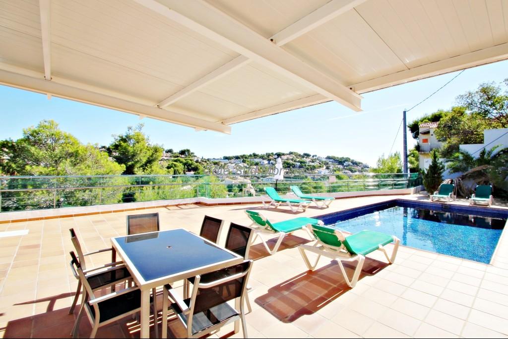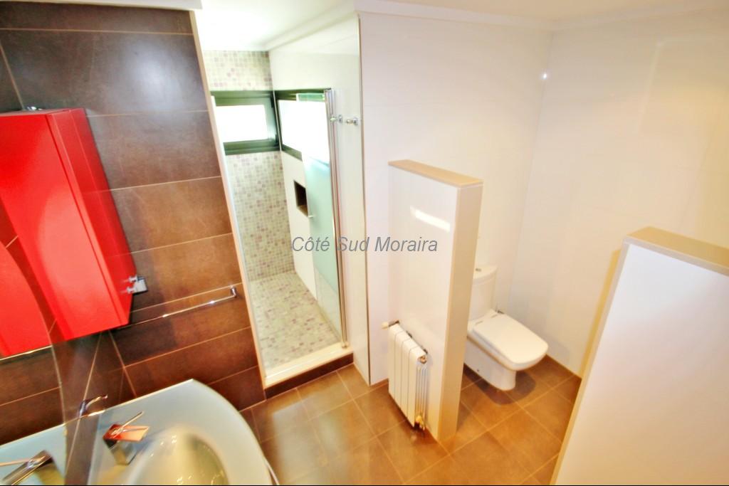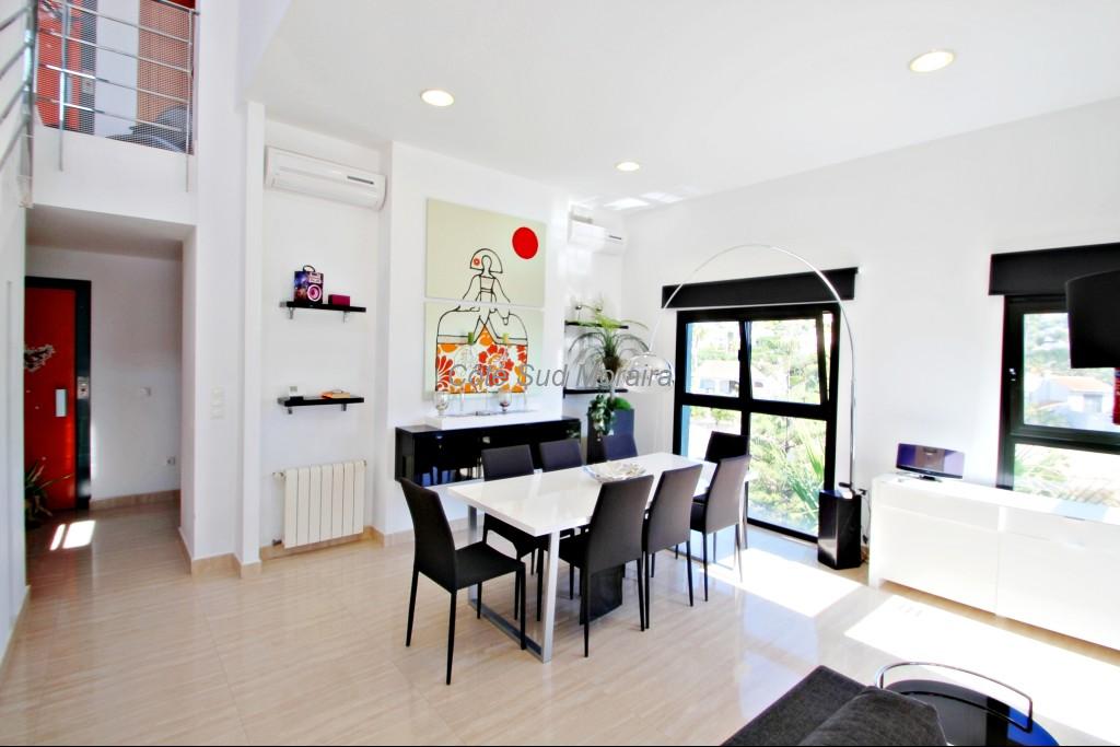 Villa in the area of El Baladrar by Benissa coast, is a very modern villa, with a central location, within walking distance to the cove El Baladrar, where you can find a nice beach bar and restaurant. Supermarket, shops and other restaurants only 1,5 km away. Villa Elena is a very modern villa with private swimming pool, spacious sun patios, outdoor dining area with BBQ. Entrance through an open parking place into a hall, steps lead down to a large open living area, plenty of space, modern kitchen full equipped, dining room and guest toilet. From the living area access to the private pool and terrace with BBQ area and outside furniture. Further steps lead down to the bedrooms: 2 double bedrooms with balcony and one twin bedroom with a shower room and a bathroom. All bedrooms with A/C. There is a lift connecting the 3 floors and a large roof sun terrace